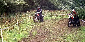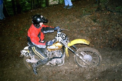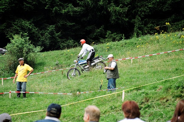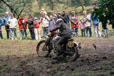 Sonntagmorgen , es hat die ganze Nacht geregnet und es regnete immer noch Keine gute Voraussetzung für eine Geländefahrt Nachdem die letzten Anweisungen für die Veranstaltung ausgegeben wurden , ging es endlich los. Ein mulmiges Gefühl im Magen in der Vorahnung das mich da was schweres erwartet, schob ich meine Maschine zum Start. Nach einigen Abschnitten über Strassen und Waldwege kam die erste schwierige Passage. Aus dem Wald heraus auf eine Steilhangwiese , diese war da ich relativ weit vorne war noch halbwegs zu befahren. Es folgte die nächste Schwierigkeit kurze Zeit später, eine steile Auffahrt im Wald. Dort musste ich das erstemal , helfende Hände an der Strecke in Anspruch nehmen - und es sollte nicht das letzte mal gewesen sein.